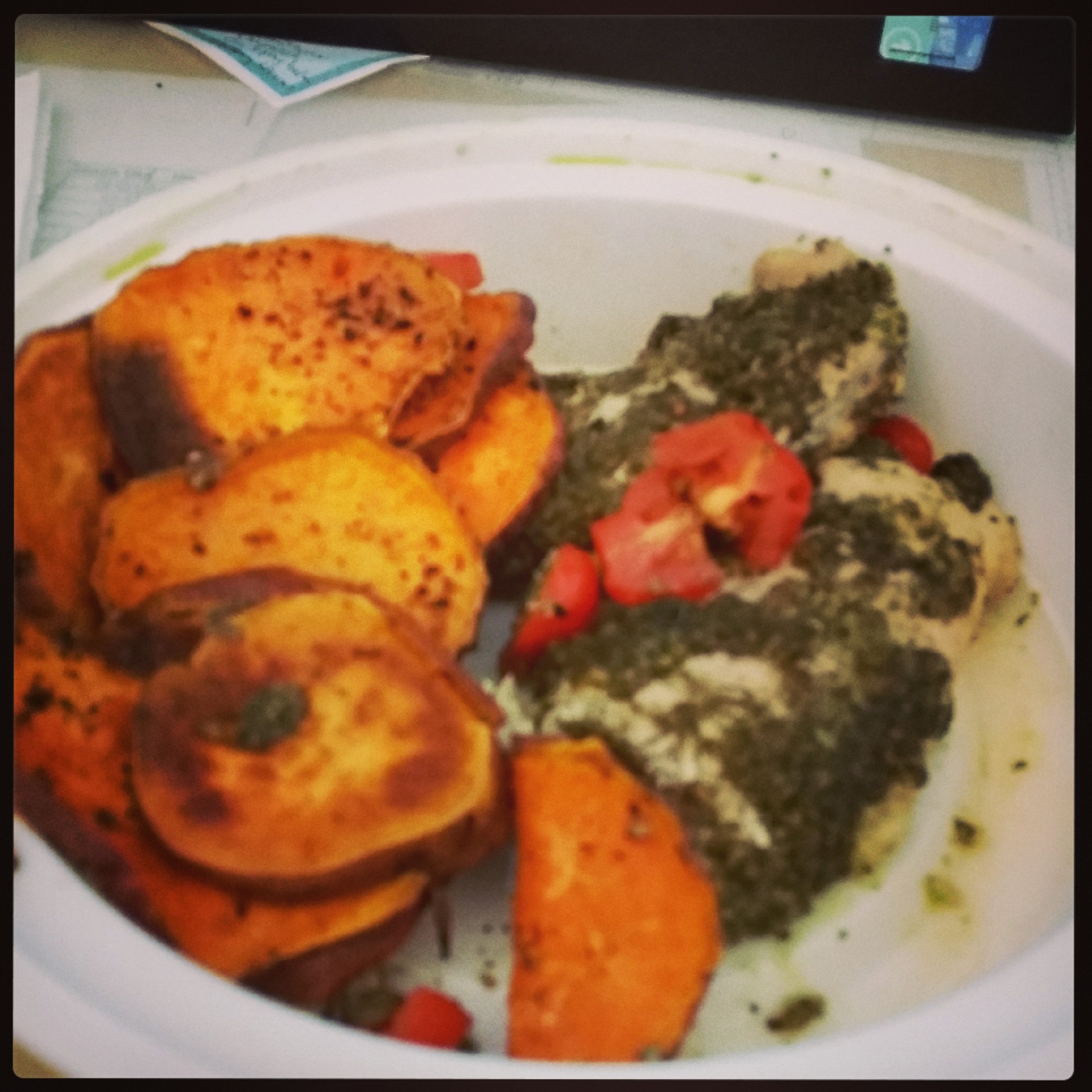 Getting back on track with pesto chicken and sweet potato chips!