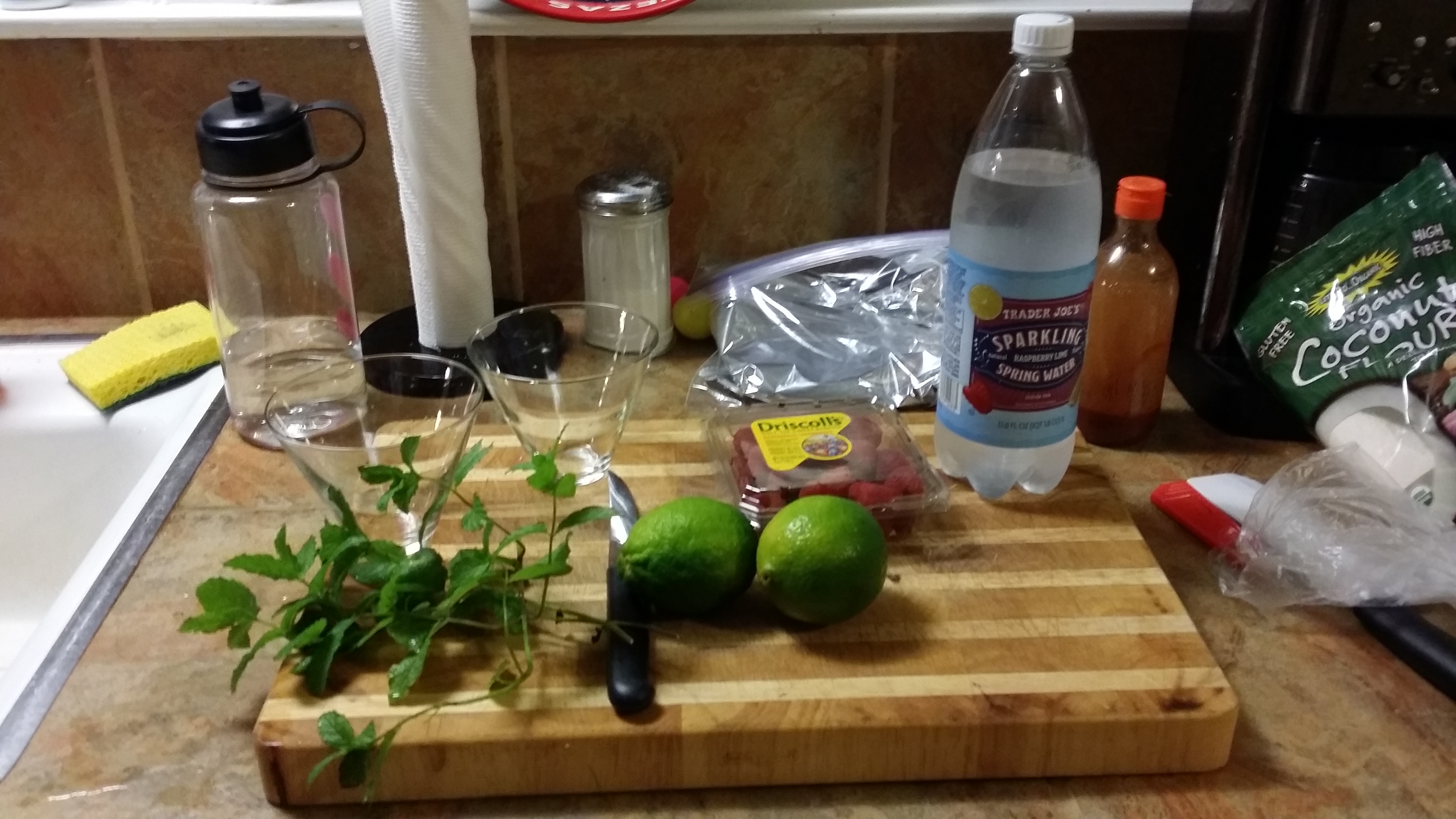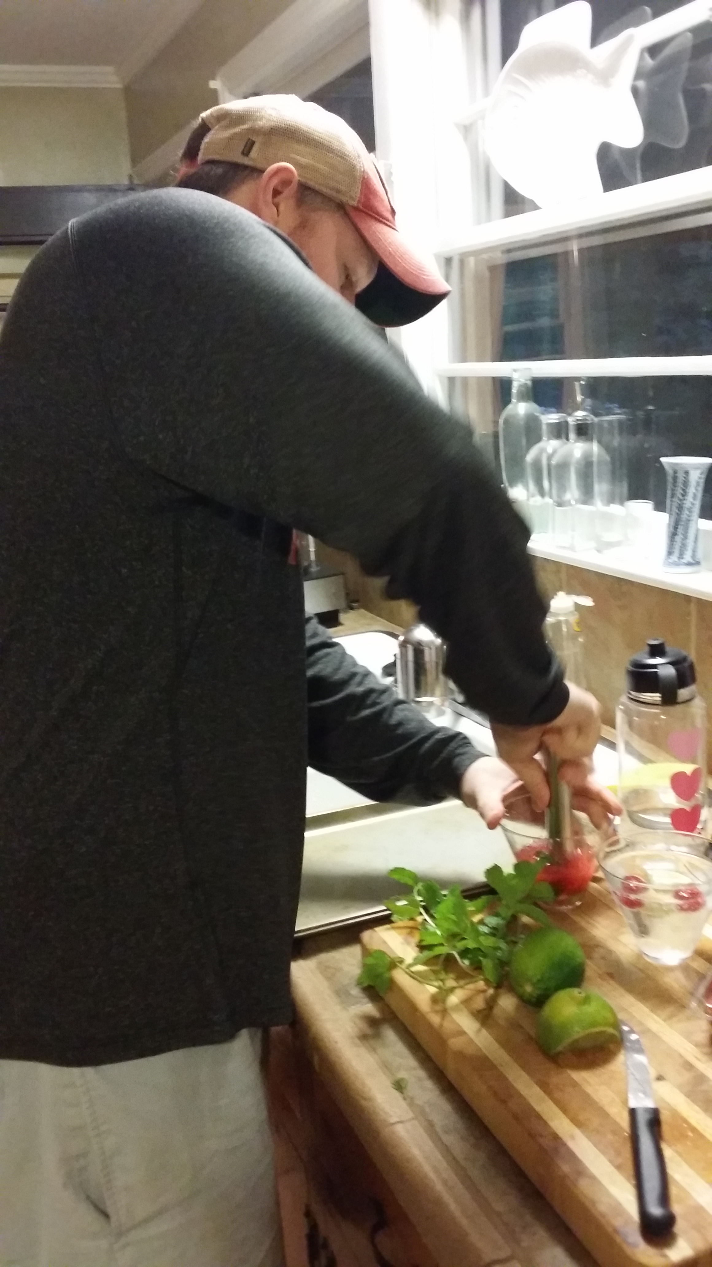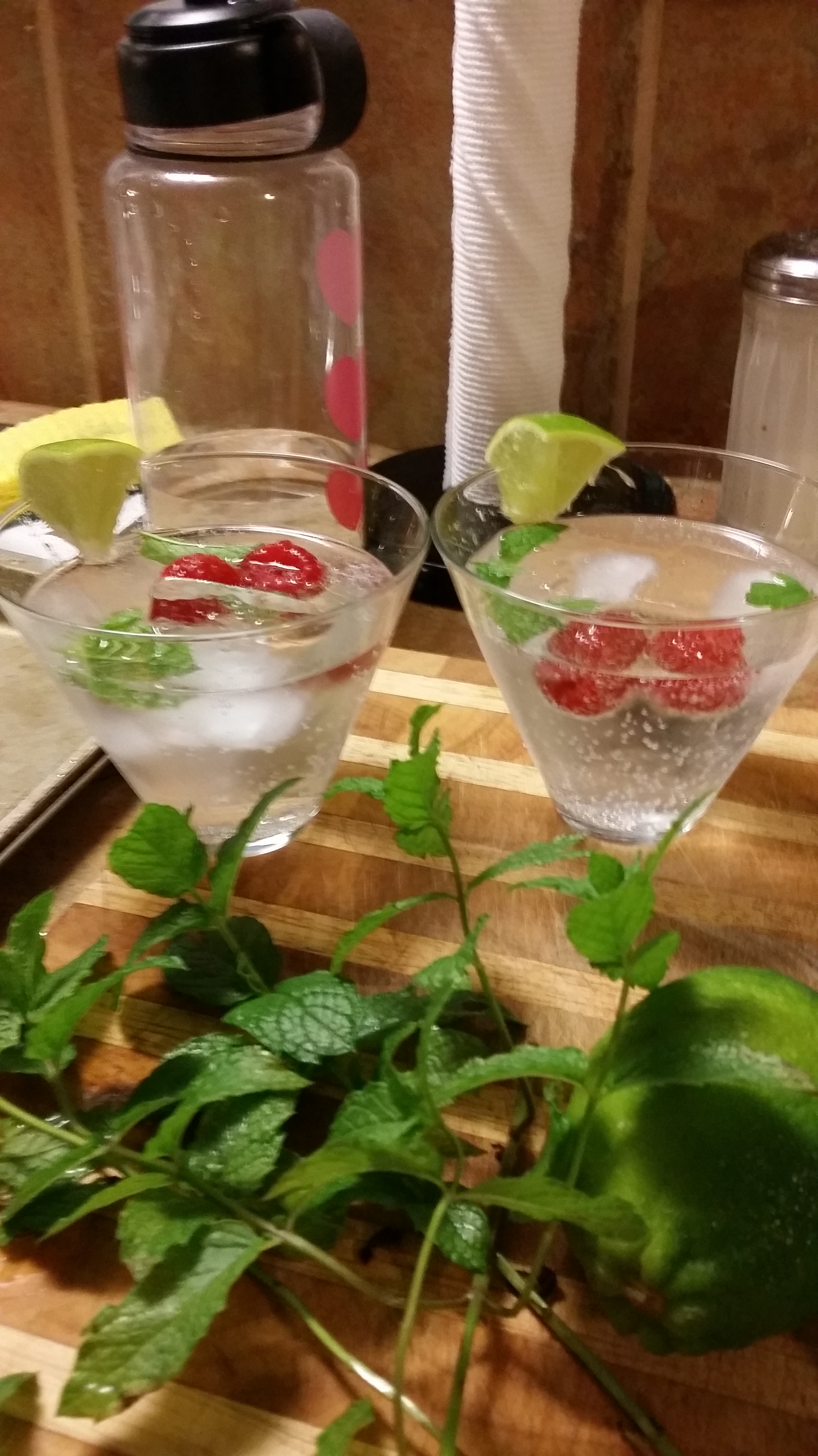 He has a little bar cart with adorable glasses, so I grabbed two, a trader joe’s sparkling raspberry lime drink, a couple of ice cubes, a handful of raspberries, lime wedges and mint from Zan’s yard! He got to muddling and viola!