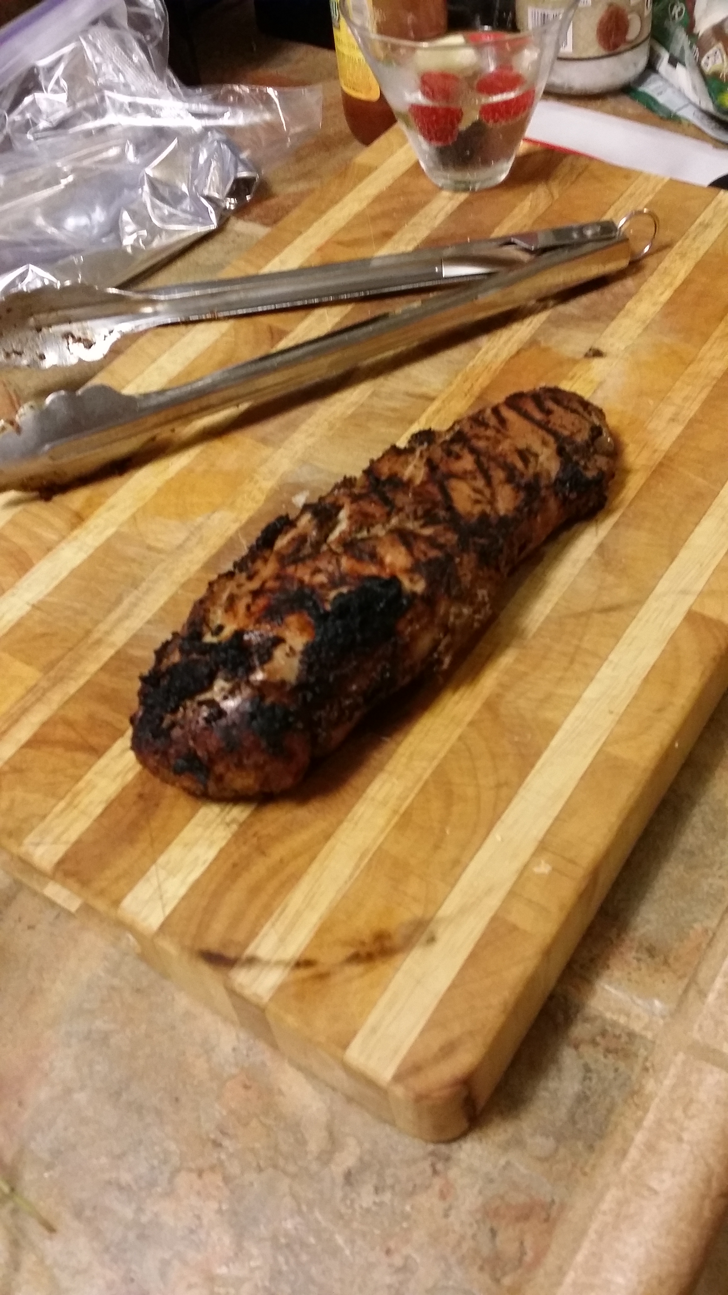 Then he marinated the pork loin in soy sauce , thai peanut sauce, ginger and garlic and fired up the grill #sohot