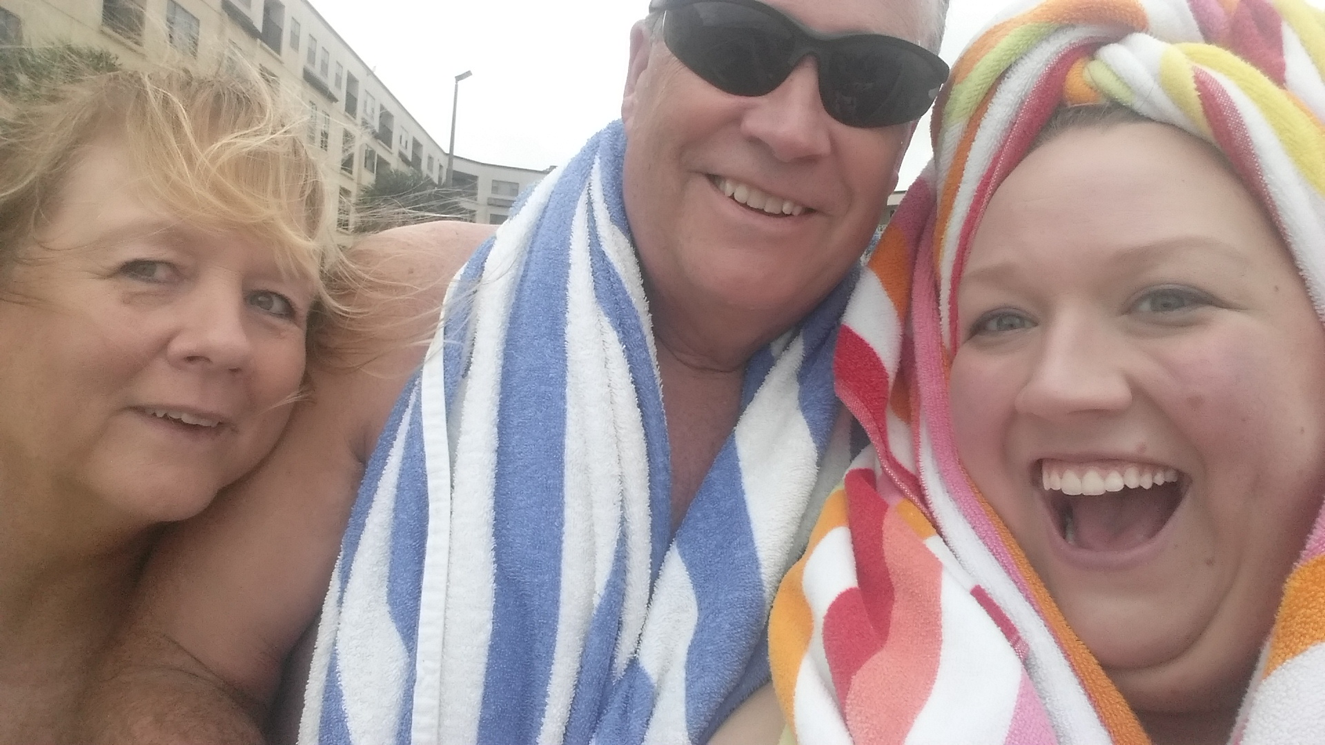 Towel hair is the funnest. We hopped on the elevator just as the bottom was falling out! Apparently someone caught a whole bunch of stinky fish and brought it back to their place one second before we hopped on.